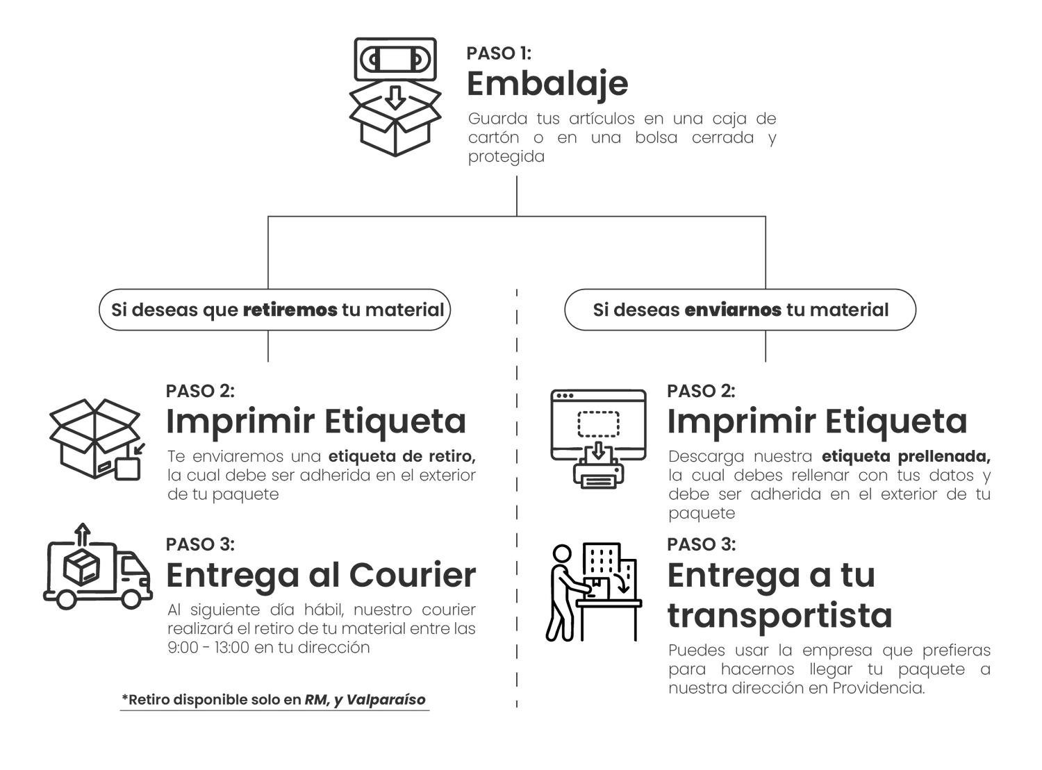 2. Retiro a domicilio: Si te encuentras dentro de la Región Metropolitana, podemos retirar tus artículos directamente en tu domicilio a través de un Courier gestionado por nosotros por un valor de $11.990 (el valor incluye retiro más despacho).