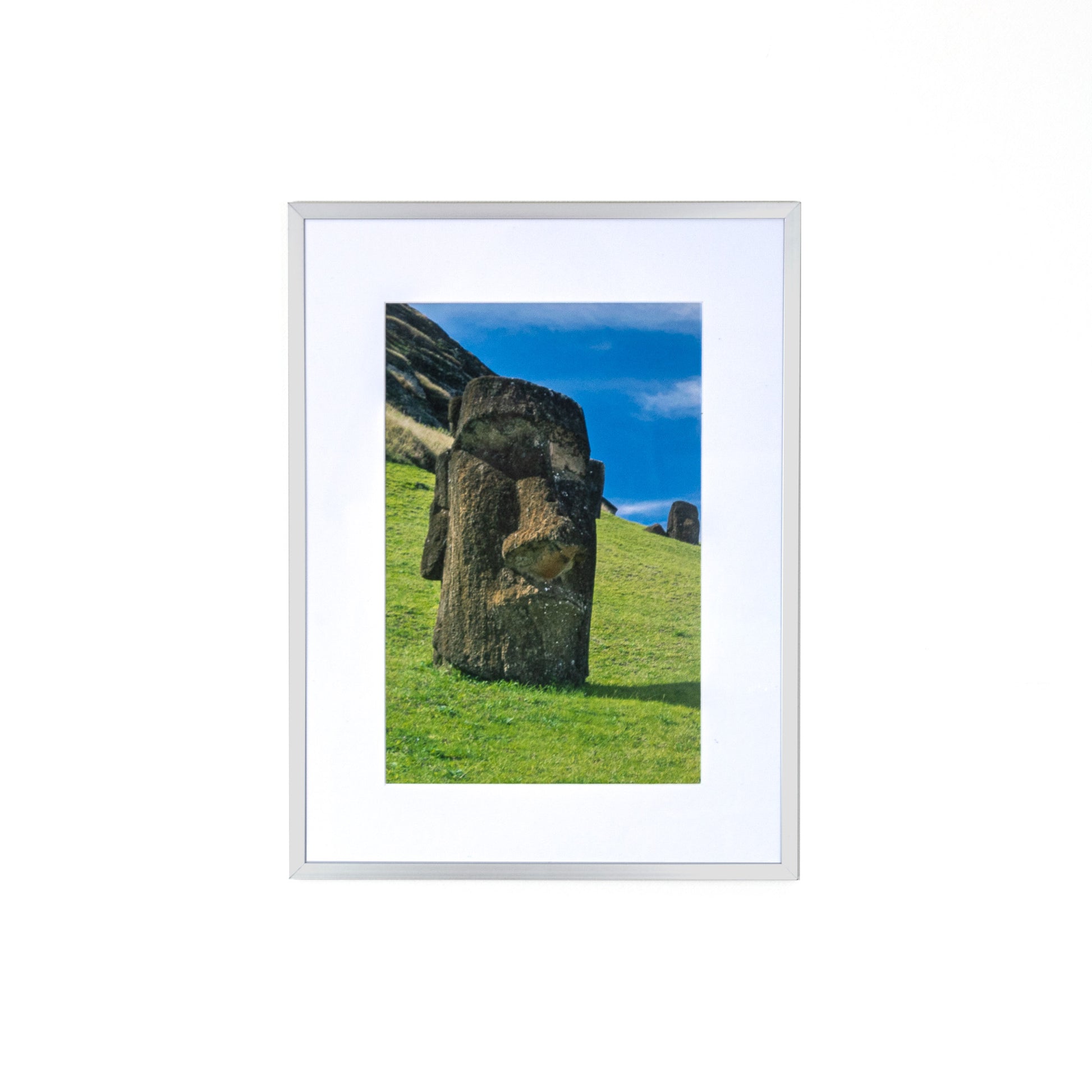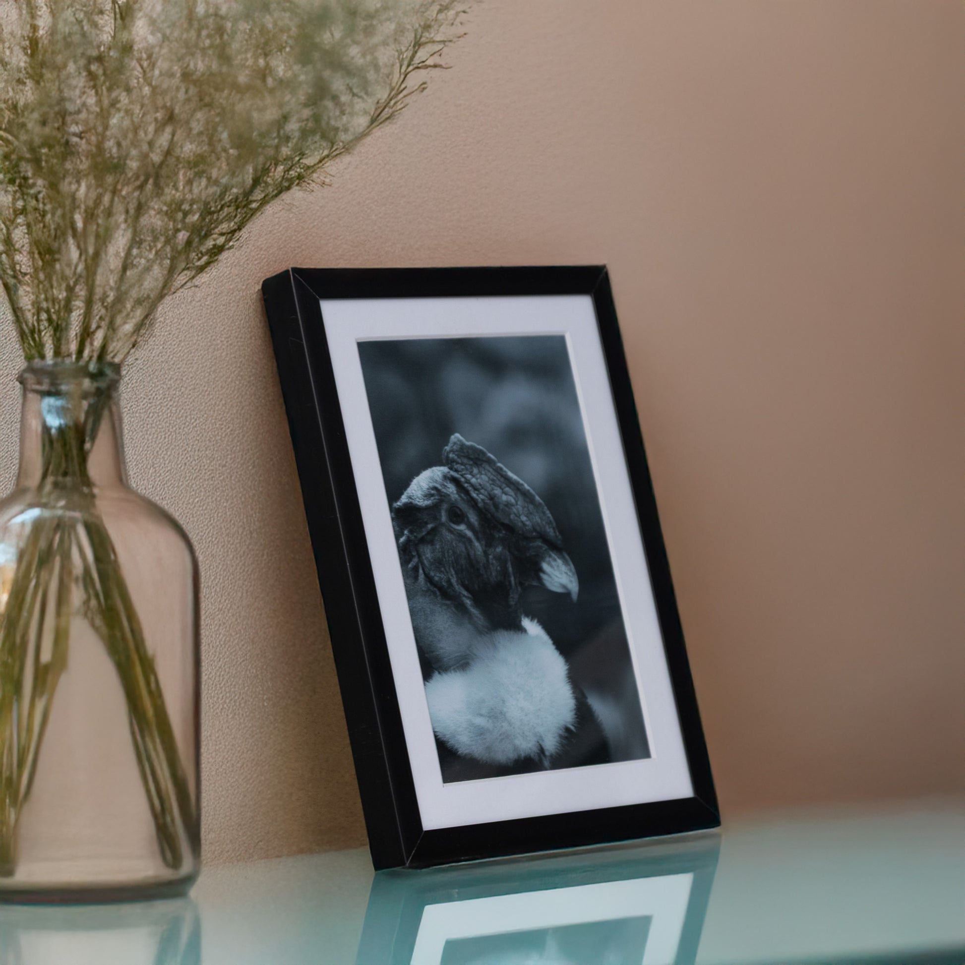 El vidrio frontal protege tu imagen con claridad y brillo, mientras que su estructura metálica de borde fino genera una sutil sombra que realza la composición. Puede colocarse en orientación vertical u horizontal, según la imagen que desees enmarcar.